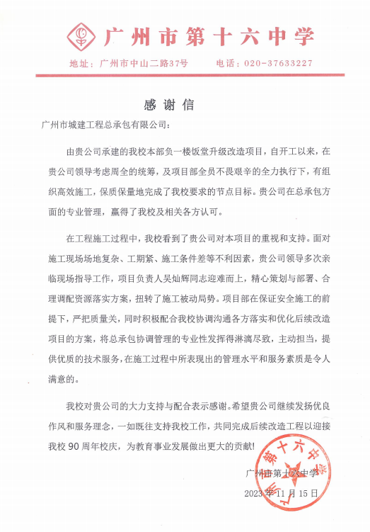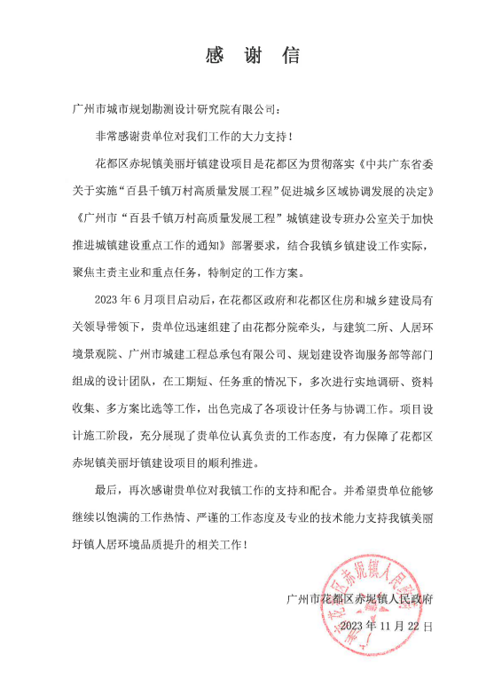 近期,公司陸續(xù)收到多個項目業(yè)主和配合單位發(fā)來的感謝信,黃埔區(qū)文沖街道辦-瑞東花園社區(qū)品質(zhì)提升項目、十六中學-校本部飯?zhí)酶脑祉椖俊⒒ǘ汲噗桄?zhèn)政府-美麗圩鎮(zhèn)全過程咨詢項目、廣州市公安局打私隊-廣園中路805號大院室外地面及A棟用房修繕工程、廣州市公安局打私支隊2021-2022年度業(yè)務用房急修項目、四川蜀西地勘集團-肇慶歷史遺留礦山生態(tài)修復工程等參建單位對公司和項目參與成員所付出的工作表示肯定和感謝。對公司的項目團隊發(fā)揮不怕疲勞、持續(xù)作戰(zhàn)的職業(yè)精神,在高強度駐場工作中表現(xiàn)出的高度工作熱情、強烈工作責任心、扎實專業(yè)素養(yǎng)和嚴謹細致的工作態(tài)度給予贊揚。