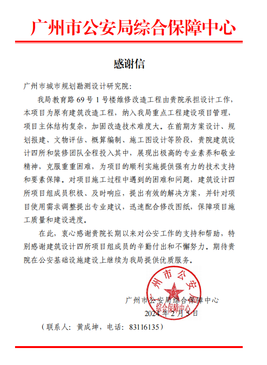 近日,廣州市公安局綜合保障中心發來感謝信,衷心感謝規劃院和我公司對教育路 69 號 1 號樓維修改造工程設計工作的支持,對我公司裝修設計團隊在室內方案設計及施工圖設計階段展現出的專業能力和敬業精神,保障了項目的順利實施給予了高度評價。為項目的順利實施提供強有力的技術支持和要素保障。