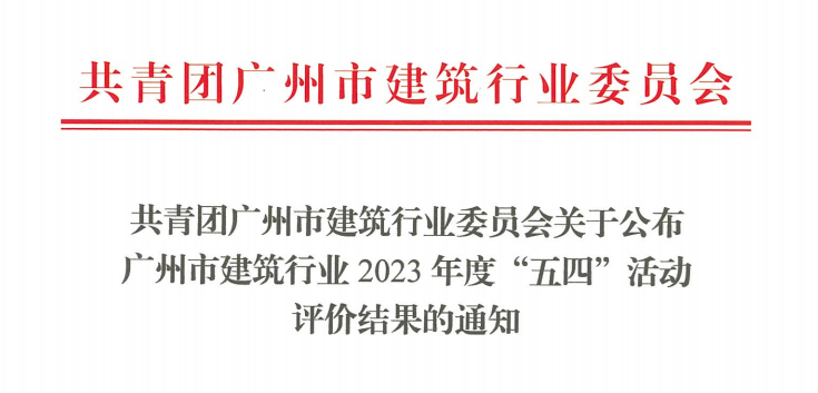 近日,廣州市建筑行業委員會舉辦廣州市建筑行業2023年度“五四”評選活動,對企業團組織、團員、團干部等日常團務管理工作進行考察評定。公司積極申報,經評審委員會綜合評定和公示,成功評為“廣州市建筑行業五四紅旗團(總...