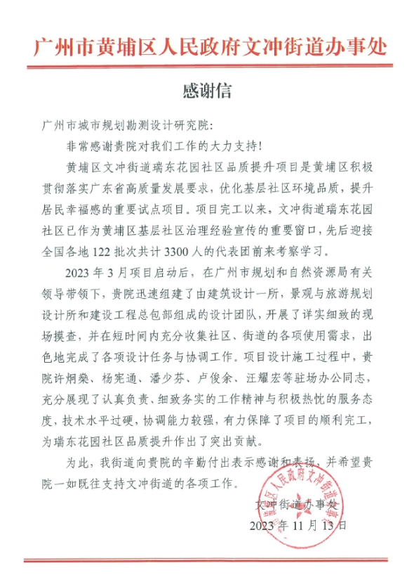 近期,公司陸續收到多個項目業主和配合單位發來的感謝信,黃埔區文沖街道辦-瑞東花園社區品質提升項目、十六中學-校本部飯堂改造項目、花都赤坭鎮政府-美麗圩鎮全過程咨詢項目、廣州市公安局打私隊-廣園中路805號大院室...